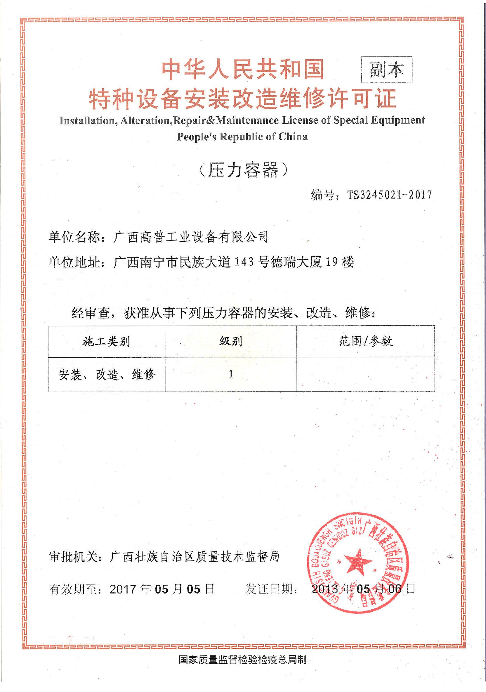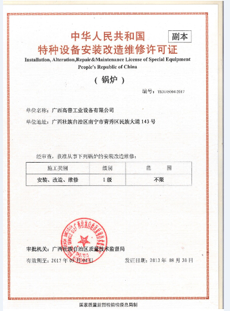 本公司是高新技術(shù)企業(yè),持有國(guó)家技術(shù)監(jiān)督局頒發(fā)的1級(jí)《特種設(shè)備安裝、改造、維修(鍋爐)》許可證,1級(jí)許可證是最高級(jí)別,可安裝、改造、維修任何形式、參數(shù)的鍋爐設(shè)備。并持有《壓力管道》安裝、改造維修許可證,1級(jí)《壓力容器》安裝、改造、維修,機(jī)電設(shè)備安裝工程專業(yè)承包3級(jí)等資質(zhì)。