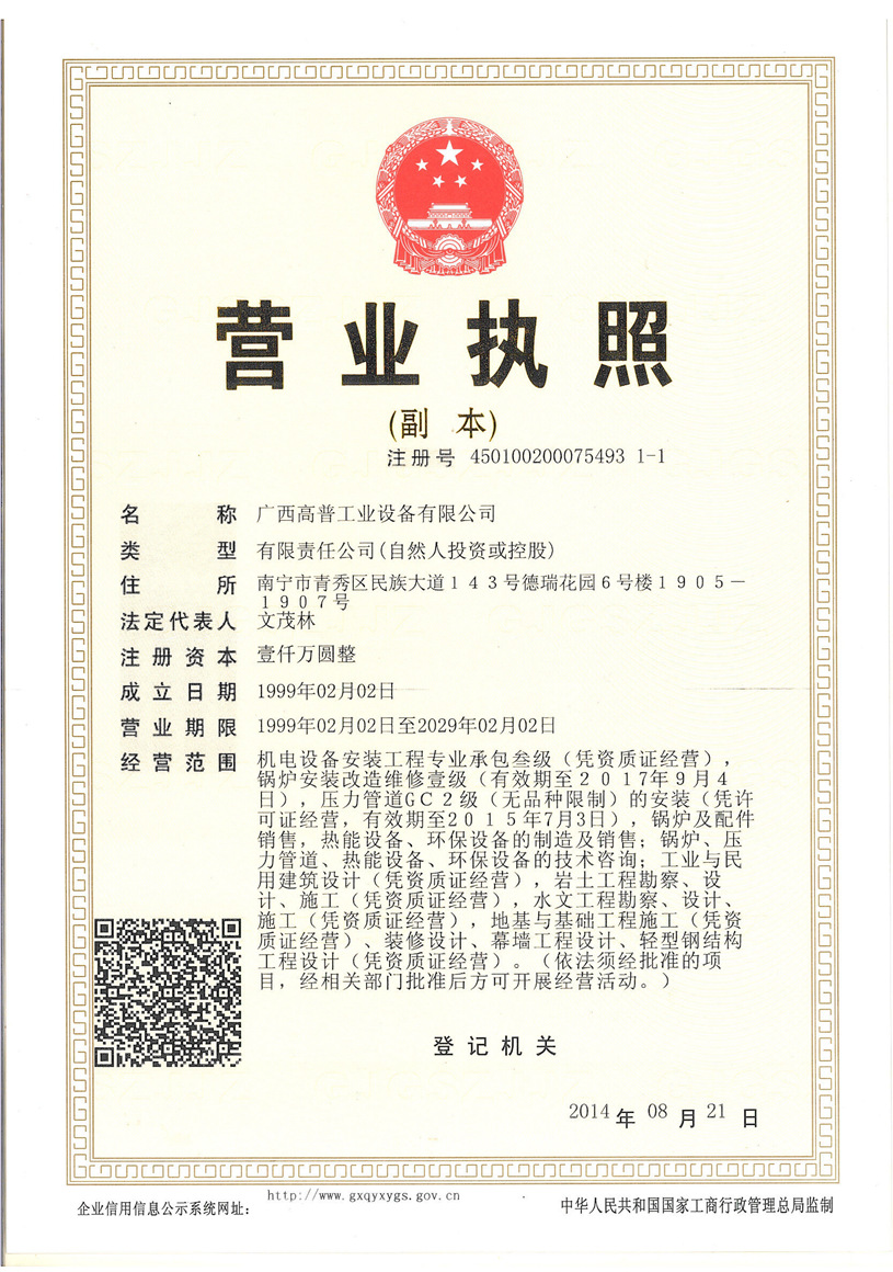 廣西高普工業(yè)設(shè)備有限公司的前身是南寧高普熱能設(shè)備有限公司,是一家成立于1998年,具有獨(dú)立企業(yè)法人資格的的有限責(zé)任公司。公司總部設(shè)在廣西首府南寧。在云南、宜賓等多處地方、地區(qū)設(shè)有辦事及分公司。
